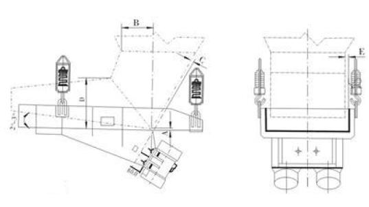 電機振動給料機設計時未考慮倉壓的影響,為保證給料機的正常運行,必須盡量減少倉壓對給料機的影響。因此在設計溜嘴時,應用溜嘴的后側板承擔料柱的垂直壓力。溜嘴形式及配置尺寸可參考圖及表中數值。