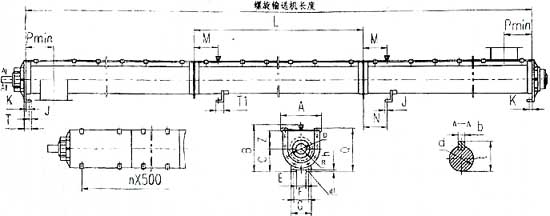 注:1、螺旋機輸送長度及尺寸L均見表二、表三。 2、圖n×500為蓋板卡子尺寸,n值視螺旋機長度而定。 3、圖中尺寸p為進出料口中心線。